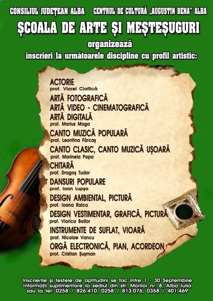 1-30 septembrie: Înscrieri la cursurile Şcolii de Arte și Meșteșugari. Canto, chitară, dans, actorie, pictură pentru tinerii din Alba Iulia