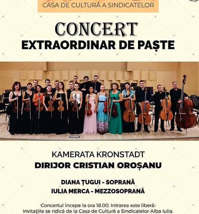 Pe 1 aprilie, de la ora 18, la Casa de Cultură a Sindicatelor, în pragul Săptămânii Patimilor, harul muzicii atinge Alba Iulia printr-un concert extraordinar despre iubire, smerenie și iertare. Kamerata Kronstadt, sub bagheta dirijorului Cristian Orosanu, susține un recital puternic precum o rugăciune, pregătind sărbătoarea celui mai mare miracol al creștinismului – Învierea lui Hristos.
