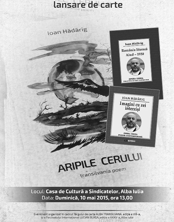 De la ora 13.00, la Casa de Cultură a Sindicatelor din Alba Iulia, vor avea loc trei lansări de carte, autor Ioan Hădărig: “Aripile cerului. Transilvania poem”, „Imagini cu zei interzişi, Colecţia opera omnia, Poezie contemporana”, „România literara, Aiud - 1930, Colecţia opera omnia, Publicistică şi eseu contemporan”.