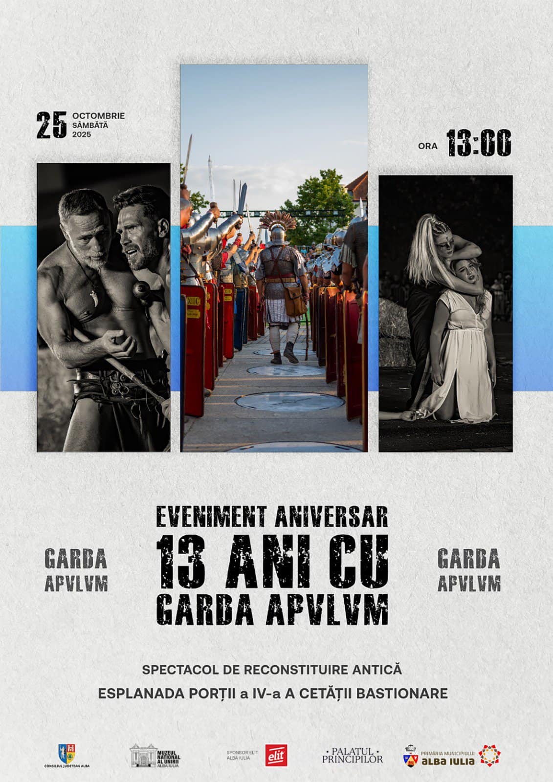 Publicul este invitat să participe la un spectacol de reconstituire istorică antică susținut de Garda Apulum la Alba Iulia, pentru a marca 13 ani de la înființarea trupei de voluntari albaiulieni care readuc la viață perioada antică a orașului Alba Iulia. Spectacolul are loc sâmbătă, 25 octombrie 2025, de la ora 13.00, în fața Porții IV a Cetății Bastionare Alba Carolina.
