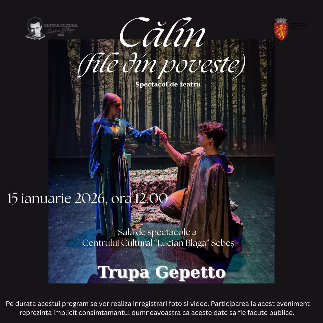 De la ora 12.00, Trupa de teatru „Gepetto” va oferi un spectacol de teatru educativ „Călin (file din poveste)” - adaptare după Mihai Eminescu. Acesta va fi prezentat pe scena sălii de spectacole a Centrului Cultural „Lucian Blaga” Sebeș.