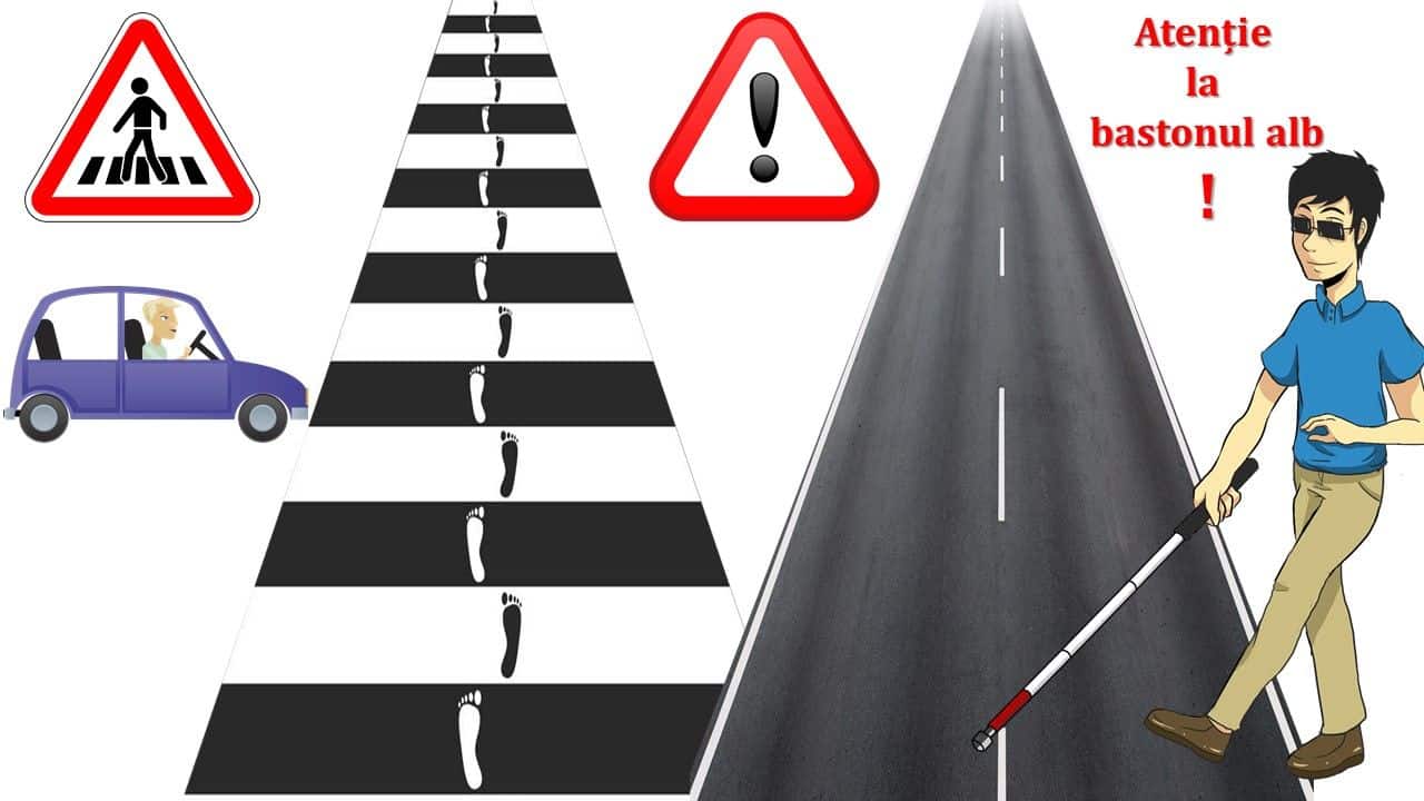 Persoanele nevăzătoare, atunci când traversează strada, ridică bastonul alb, iar participanții la trafic au obligația de a opri imediat și de a le acorda prioritate, inclusiv în afara trecerilor de pietoni.