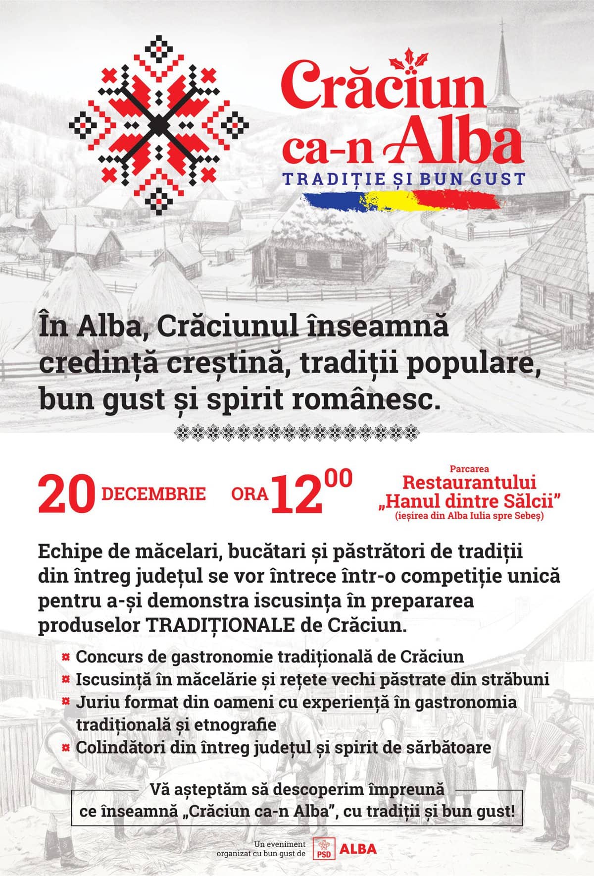 „În Alba, Crăciunul înseamnă credință creștină, tradiții populare, bun gust și spirit românesc. Alături de colegii mei social-democrați din întreg județul lansăm un eveniment cultural unic, prin care promovăm obiceiurile și gastronomia tradițională de Crăciun.