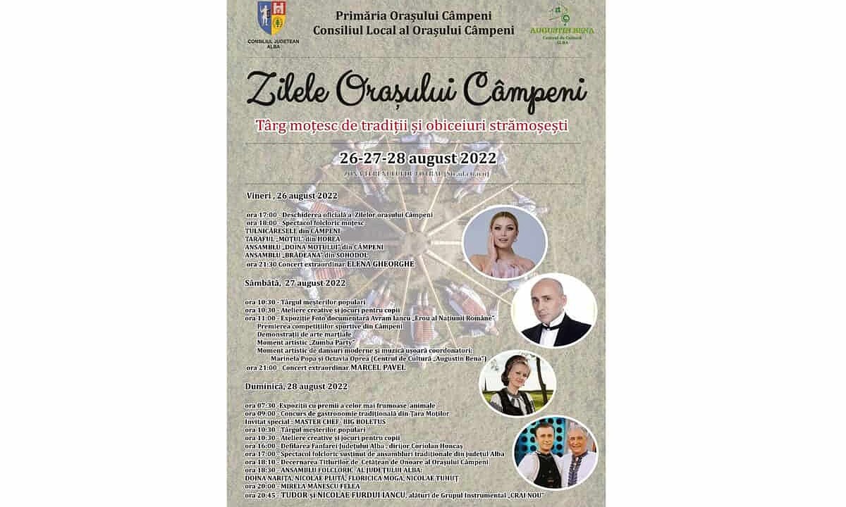 26-28 august: Zilele Orașului Câmpeni: Târg moțesc și concerte Marcel Pavel, Elena Gheorghe și Nicolae Furdui Iancu. PROGRAM