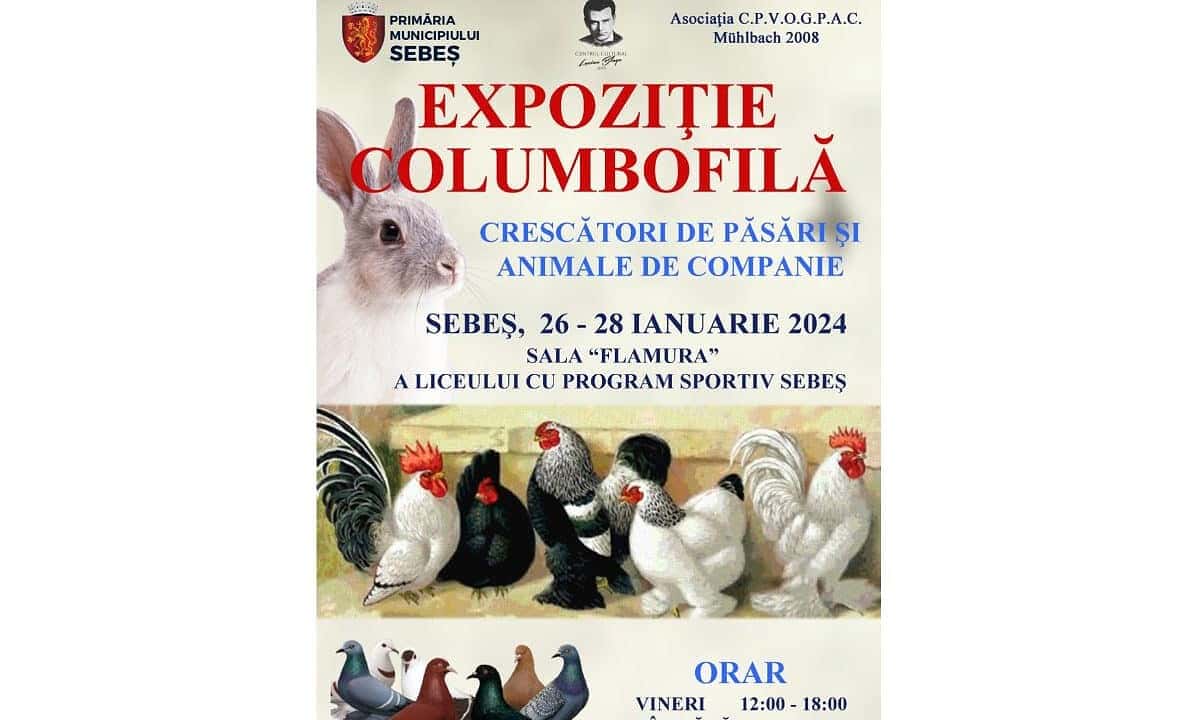 Primăria Municipiului Sebeş, în parteneriat cu Centrul Cultural „Lucian Blaga” şi cu Asociaţia crescătorilor de porumbei voiajori, de ornament, păsări şi animale de companie „Mühlbach 2008” organizează, în perioada 26 – 28 ianuarie 2024, o nouă ediţie a „Expoziţiei Columbofile”.