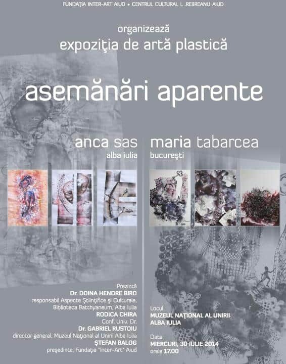 30 iulie: „Asemănări aparente”, expoziţie de artă plastică la Muzeul Naţional al Unirii din Alba Iulia. Lucrări semnate de Anca Sas şi Maria Tabarcea