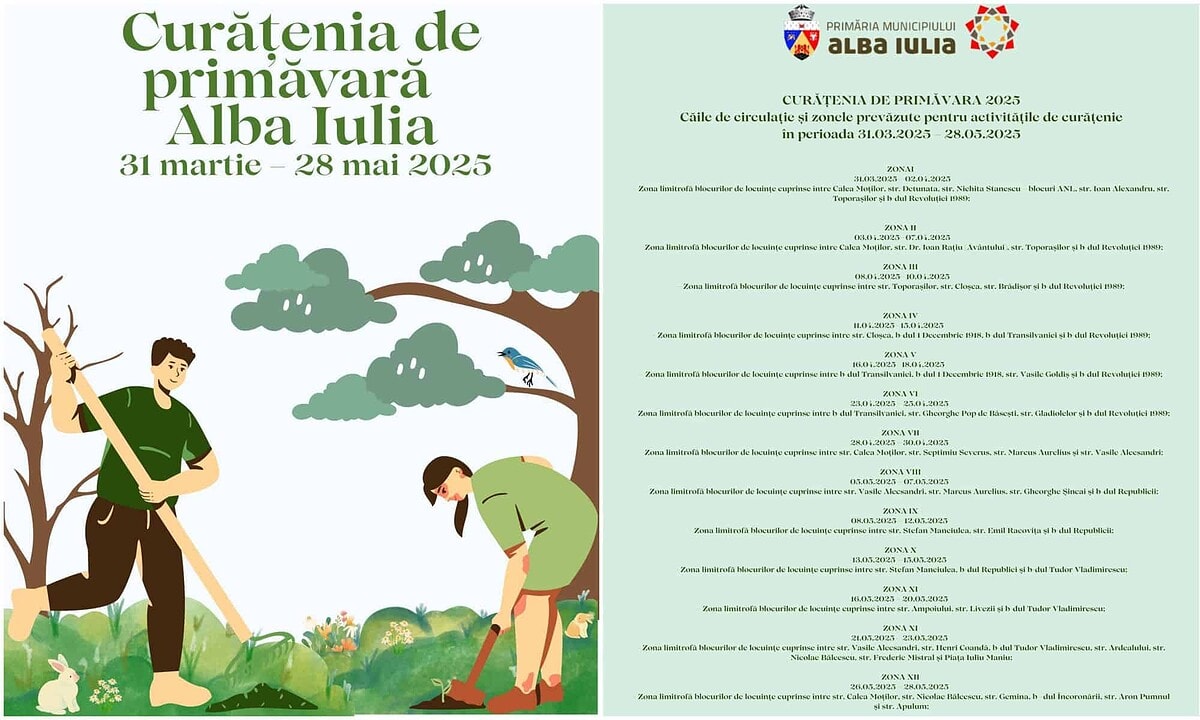 Primăria Alba Iulia dă startul campaniei „Curățenia de Primăvară 2025” și îi invită pe cetățeni să se alăture acestui colectiv pentru un oraș mai curat, mai civilizat și mai prietenos cu mediul.