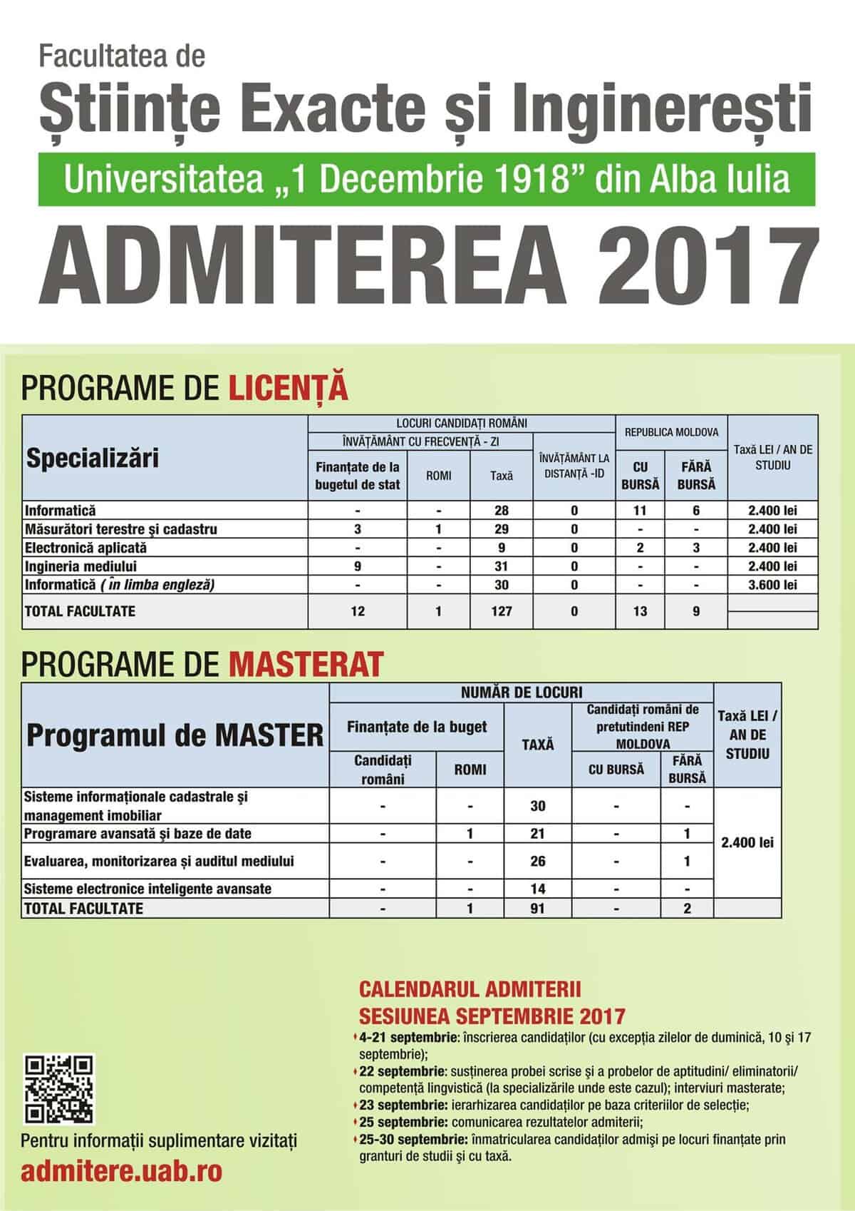 – pentru candidaţii la specializarea Informatică, care au obţinut premii la concursul şcolar in4it-UAB 2017 organizat de Universitatea „1 Decembrie 1918” din Alba Iulia şi care au optat în cadrul admiterii pentru înlocuirea criteriului general de admitere în anul universitar 2017-2018, reprezentat de Media la Bacalaureat, cu nota obţinută la concurs, este necesară Diploma de premiu (I, II, III sau menţiune), în original (este prezentată comisiei de admitere în original şi în dosar se păstrează copia certificată conform cu originalul de către comisia de admitere);