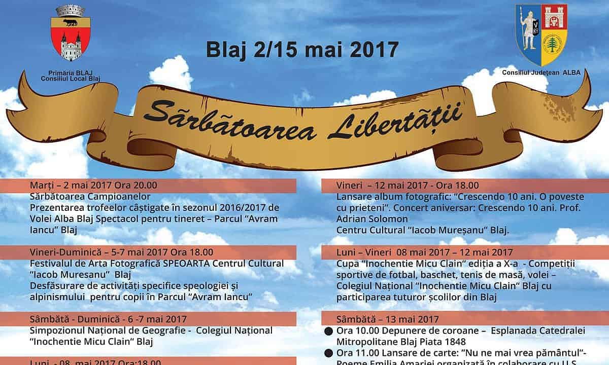 În acest an, în cadrul manifestărilor au fost incluse şi două evenimente desfăşurate în această săptămână: Seara Campioanelor şi Festivalul Speoarta. "Sărbătoarea Libertăţii" 2017 este organizată de Primăria şi Consiliul Local Blaj.