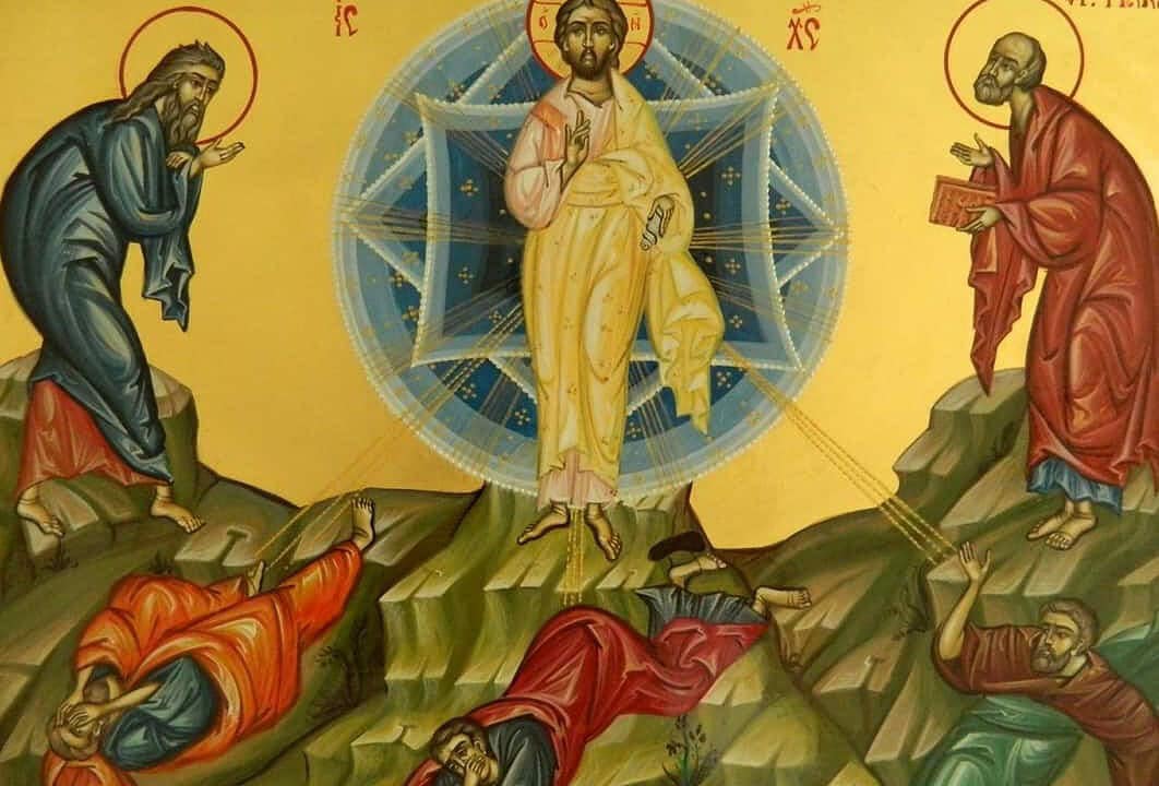 Pe muntele Tabor, pe când Iisus se ruga, apostolii, moleşiţi de somn, tresar deodată la o privelişte nemaivăzută: chipul Mântuitorului s-a făcut altul, faţa Lui strălucea ca soarele, iar hainele Lui se făcuseră albe că zăpada.