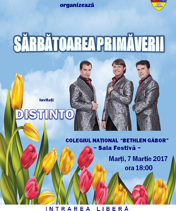 Primăria municipiului Aiud, în pragul aceste sărbători simbol, în data de 7 martie 2017, începând cu ora 18:00, în Sala Festivă a Colegiului Național Bethlen Gabor din Aiud, ca un omagiu adus tuturor femeilor din municipiul nostru, organizează un concert susținut de cunoscuții tenori din grupul Distinto.