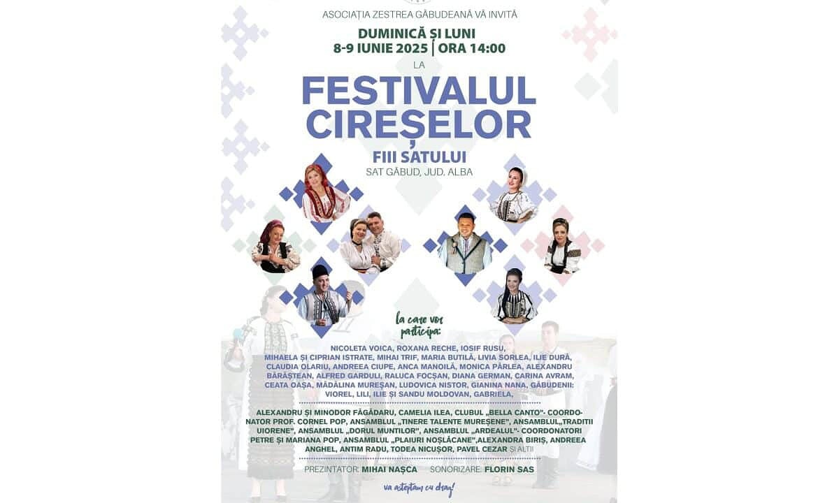 Duminică, 8 iunie și luni, 9 iunie, în satul Găbud din comuna Noșlac va avea loc evenimentul „Festivalul Cireșelor - Fiii satului”.