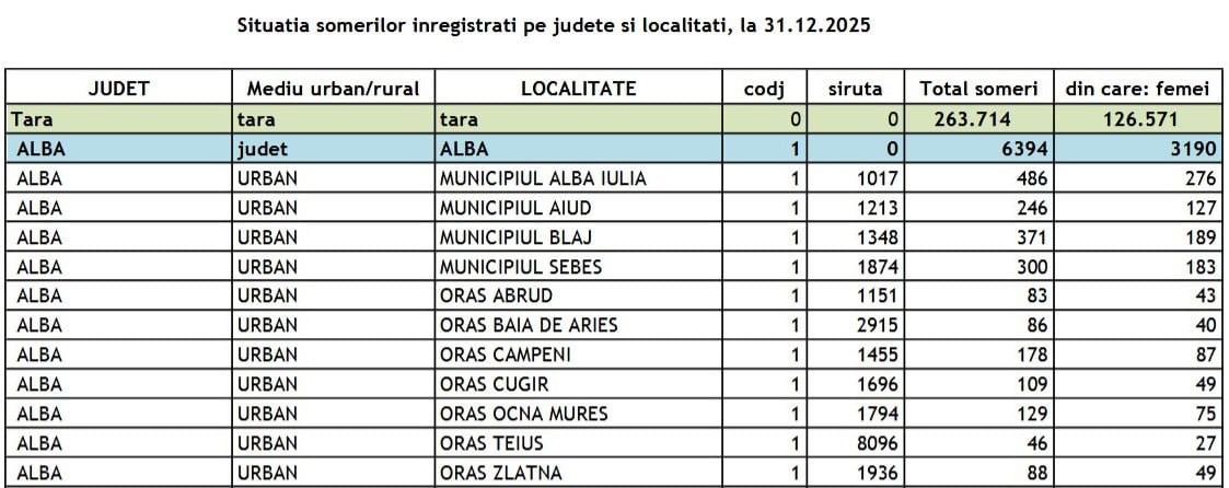 În județul Alba, rata șomajului a ajuns la 4,20% la finalul lunii decembrie 2025, față de 4,13% în noiembrie 2025 și 3,45% în decembrie 2024. Sunt 6.394 de șomeri (în decembrie 2024 erau doar 5.310), din care: