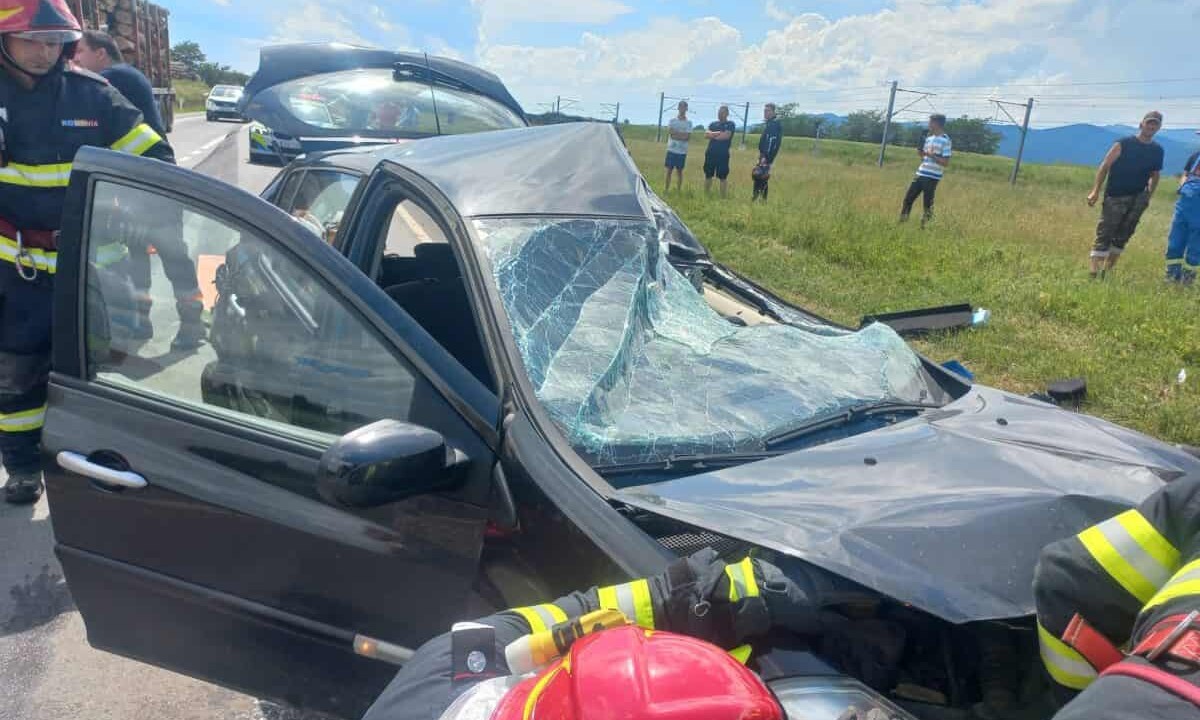 UPDATE 15.08: După ce au ajuns la fața locului, pompierii militari au oferit mai multe informații. Deși inițial au spus că erau trei persoane încarcerate între fiarele mașinii, doar o singură persoană a rămas blocată.