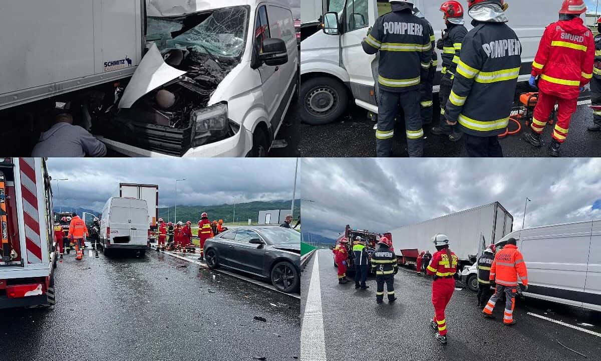 UPDATE FOTO: Accident grav pe autostrada A1 zona la Veștem, Sibiu. Impact între un microbuz și un TIR. Trafic blocat
