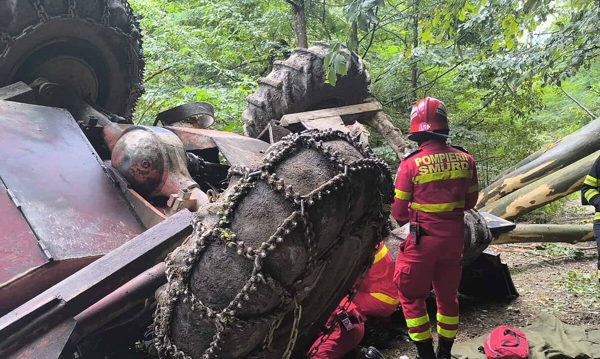 Din informațiile preliminare ar fi vorba despre de un utilaj forestier răsturnat, posibil o persoana conștientă, blocată sub utilaj.