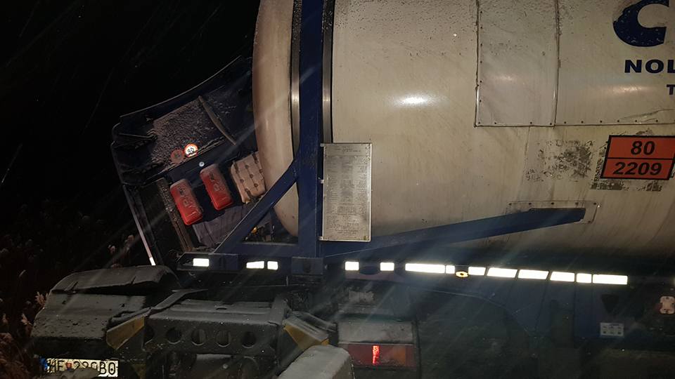 UPDATE: „Un camion cisternă a rupt un parapet și s-a oprit deasupra unui canal.Un alt camion l-a lovit din spate.Nu sunt victime cu leziuni majore. Șoferul autocisternei a fost transportat pentru evaluare la spitalul din Turda. Amândoi șoferii erau cetățeni străini. Am fost la fața locului împreuna cu domnul inspector șef ISU Oprișa Cornel, pentru a mă asigura că nu sunt puse în pericol viețile altor persoane” spune prefectul județului Alba, Dănuț Hălălai, pe pagina de facebook.