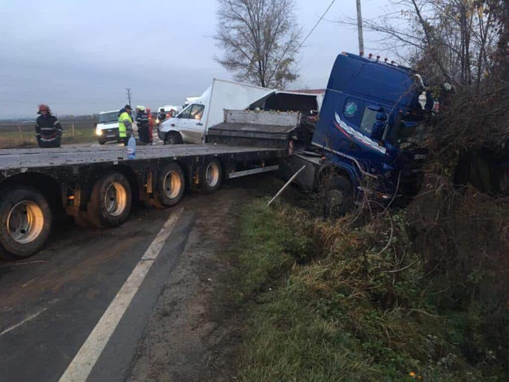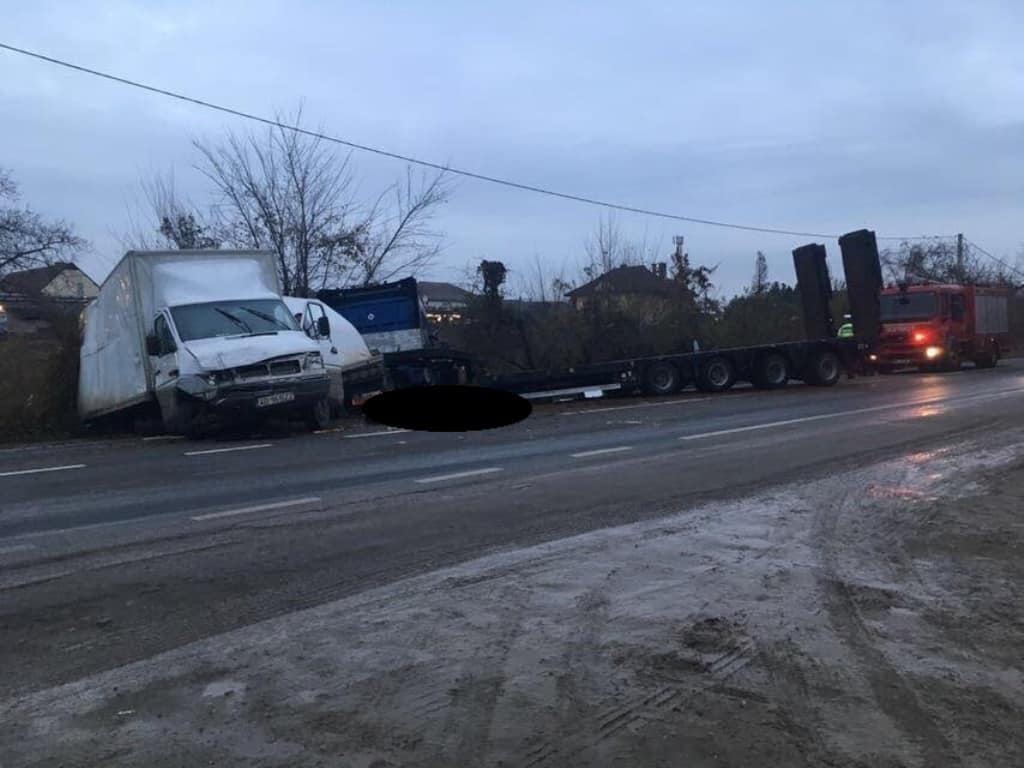 Centrul InfoTrafic Poliţia Română a precizat că în accident au fost implicate două autotrenuri şi două autoutilitare. Evenimentul a avut loc în jurul orei 6.50 şi s-a soldat cu rănirea uşoară a unei persoane.