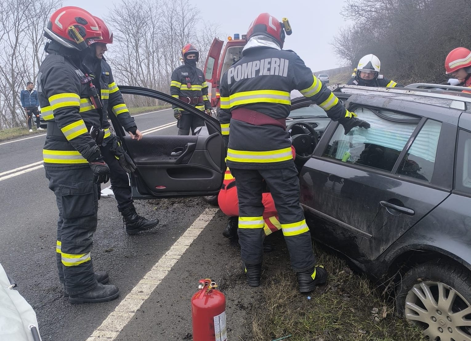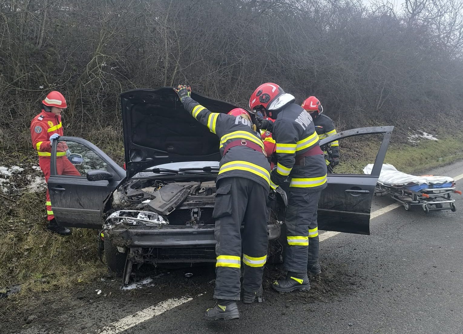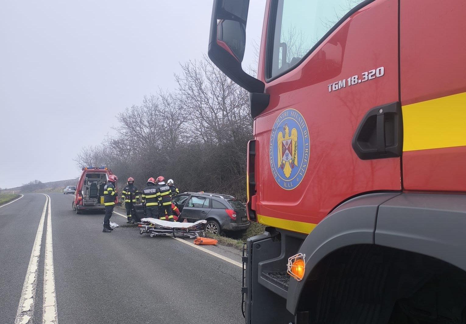 Se asigură în continuare măsurile specifice, la locul accidentului, de către pompierii militari.
