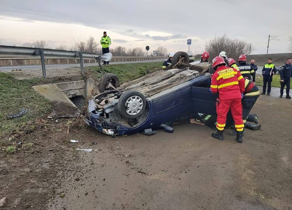 Polițiștii transmit că autoturismul s-a răsturnat în afara carosabilului.