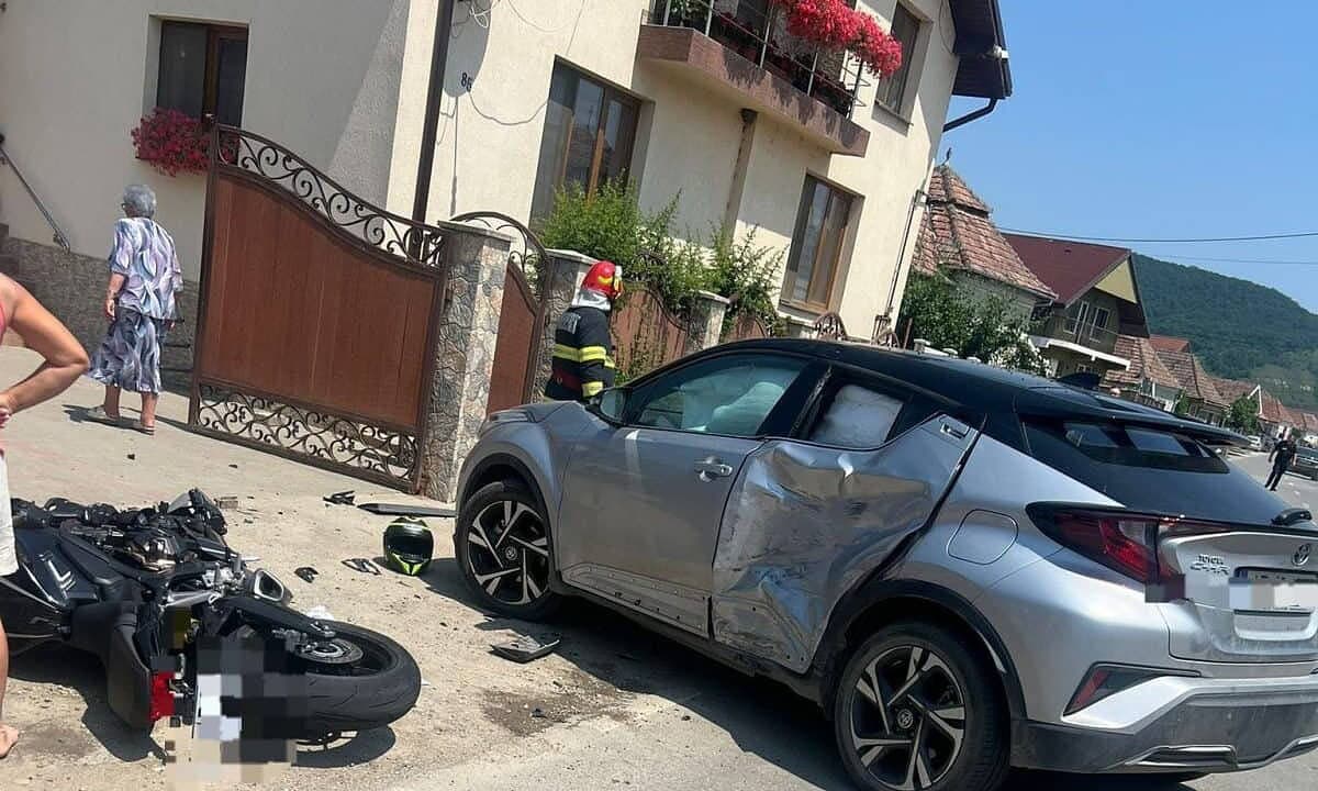 UPDATE FOTO: ACCIDENT rutier la Ciumbrud. Un motociclist de 21 de ani a ajuns în stare gravă la spital după impactul cu o mașină