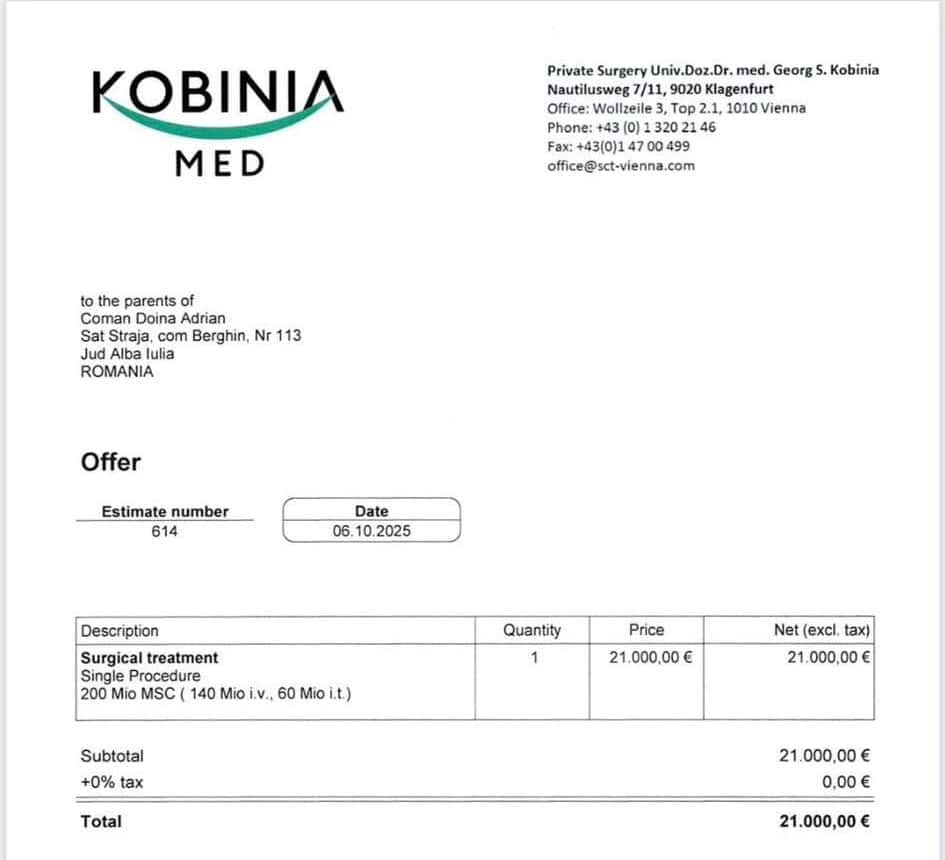 În 2024, am găsit o clinică din Viena, Med Kobinia, de unde am primit speranța că transplantul cu celule stem îl va ajuta în recuperarea lui Sebi.