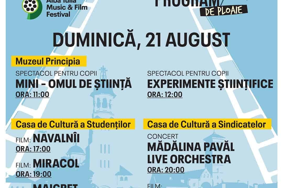 „Pentru că se anunță o zi ploioasă, ne vom strecura printre stropi și intrăm în săli. Proiecțiile și concertele programate la Alba Iulia Music and Film Festival vor putea fi urmărite în Muzeul Principia, Casa de Cultură a Studenților și Casa de Cultură a Sindicatelor”, au transmis organizatorii.