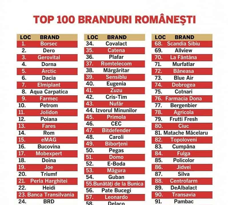 Clasamentul celor 100 de mărci româneşti a fost realizat pe nouă categorii de produse şi servicii, pe baza studiului ce a cuprins 1000 de interviuri online, fiind reprezentativ la nivel urban, la nivel de regiune, grad de urbanizare, împărţire pe sex şi vârstă a populaţiei între 18 – 55 de ani.