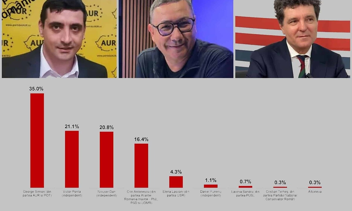 Nicușor Dan s-ar afla pe locul trei, cu 20,8%, urmat de Crin Antonescu cu 16,4% și Elena Lasconi cu 4,3%.