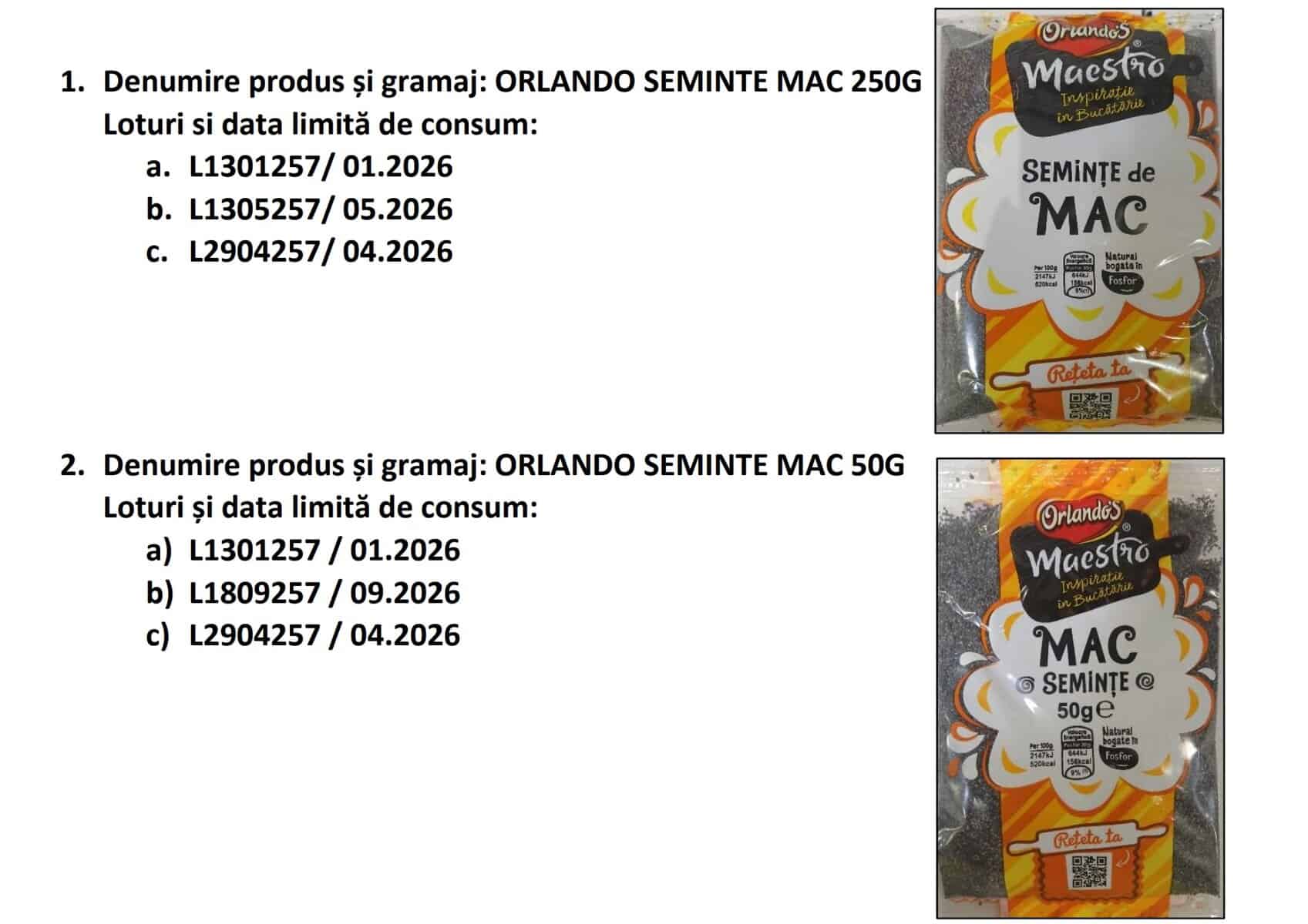 Mai multe loturi de semințe de mac, comercializate sub brandurile Orlando, Orlandos Maestro și Nutco au fost retrase de pe rafturile magazinelor Profi și Selgros din Alba și din țară, după ce s-a constatat că depășesc concentrația admisă de alcaloizi de opiu.