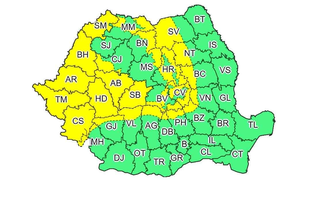 Al doilea Cod galben vizează județele Satu Mare, Maramureș, Bistrița Năsăud, Suceava, Mureș, Harghita, Neamț, Bacău, Vrancea, Covasna, Buzău, Prahova, Brașov, Cluj, Dâmbovița, Argeș, Vâlcea, Sibiu, Alba, Hunedoara, Gorj, Mehedinți, Caraș Severin, Timiș, Arad și Bihor.