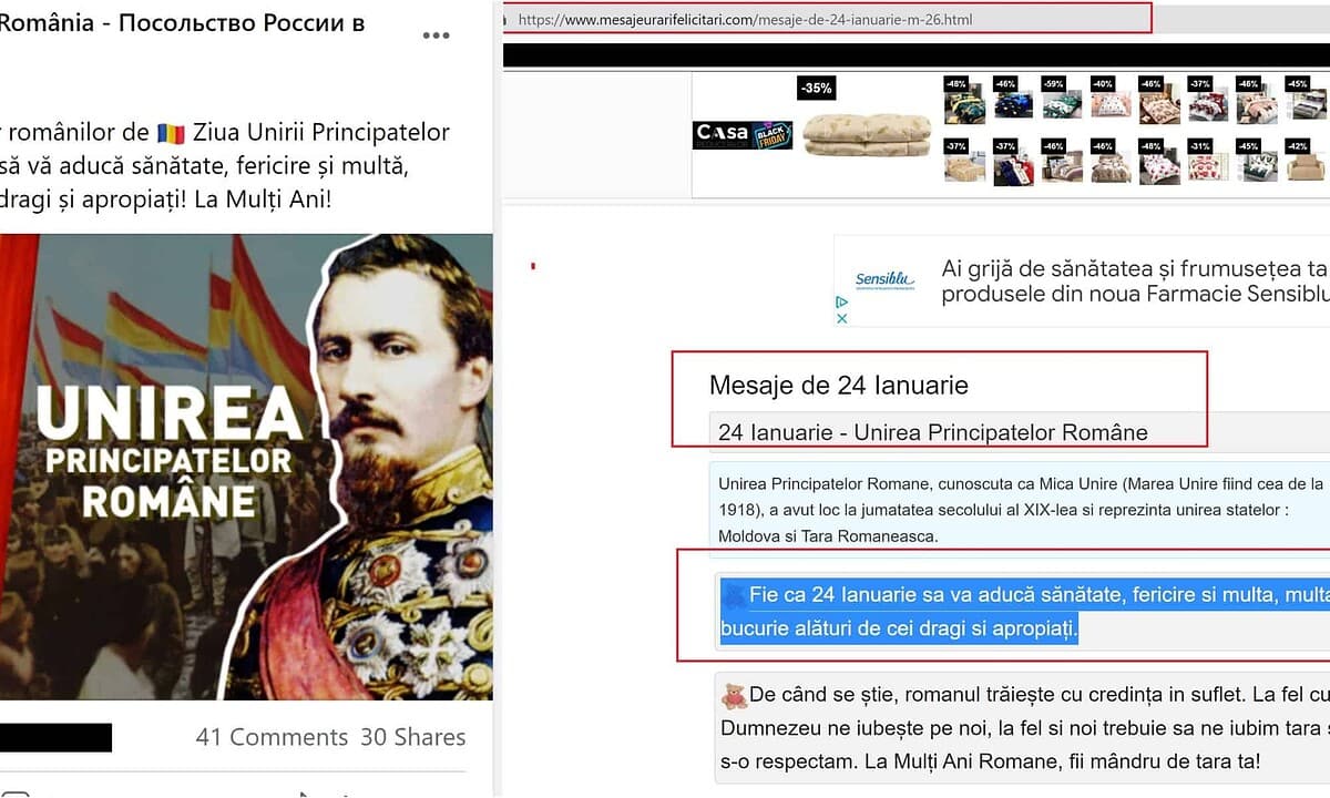 Ambasada Rusiei în România a copiat de pe internet, un mesaj adresat românilor cu ocazia Unirii Principatelor Române. Mesajul a fost postat pe pagina oficială de Facebook a ambasadei.