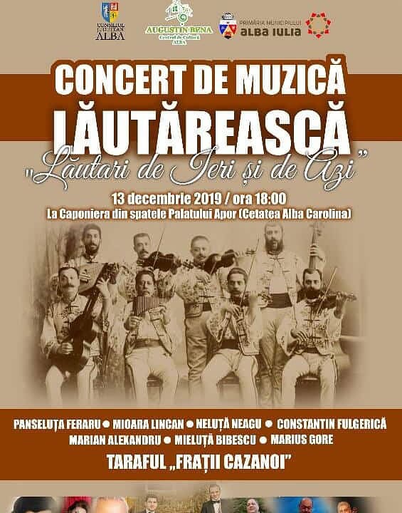 Centrul de Cultură „Augustin Bena” Alba organizează, vineri, 13 decembrie, începând cu ora 18.00, concertul „Lăutari de ieri și de azi”, un eveniment cultural-artistic unic în care își dau întâlnire o parte dintre cei mai valoroși lăutari români.