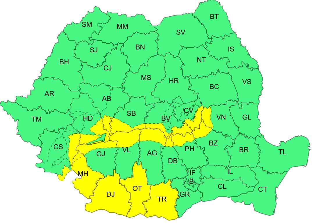 În vestul și sudul Olteniei și în sud-vestul Munteniei vor fi intensificări ale vântului cu viteze de 50-70 km/h.