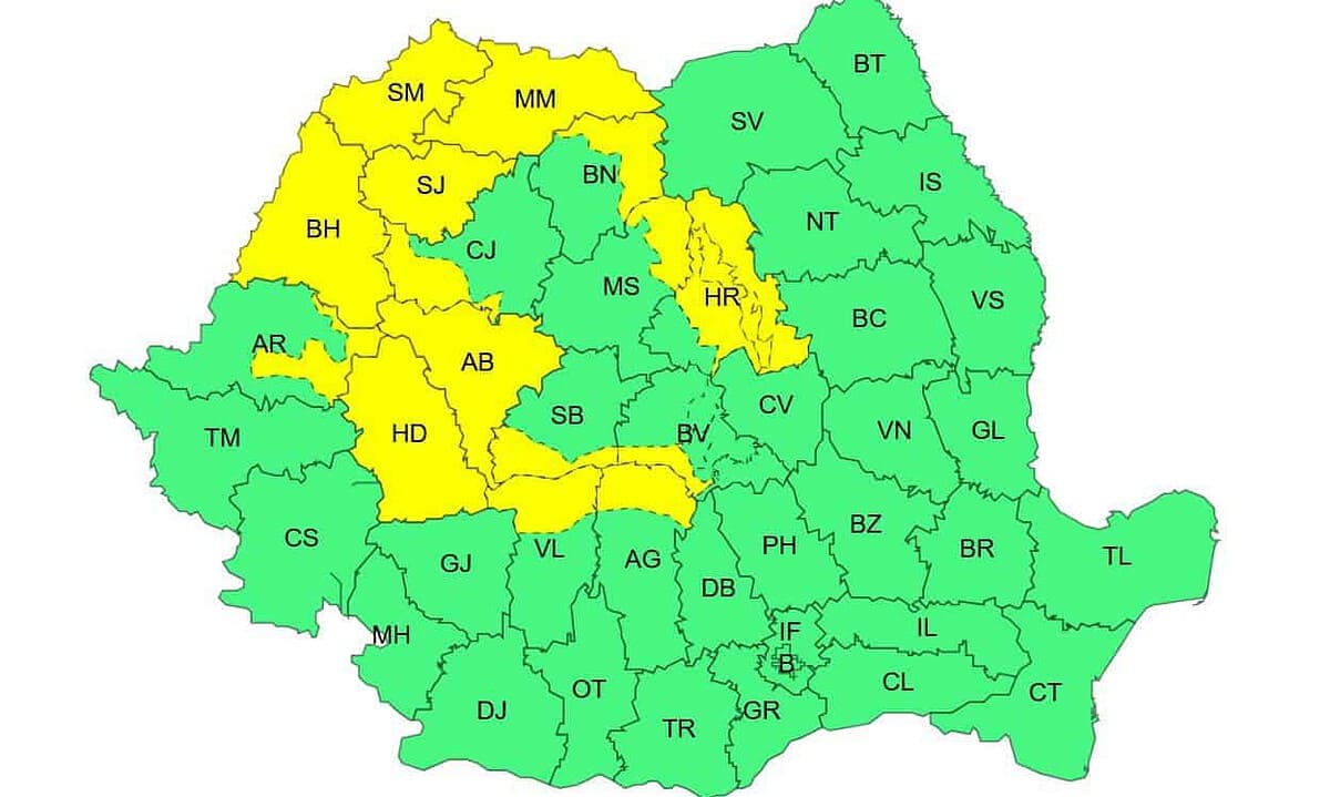 Potrivit meteorologilor, în intervalul orar 12:00 - 23:00, în nordul Crișanei, Maramureș, vestul Transilvaniei și local la munte vor fi perioade cu instabilitate atmosferică, ce se va manifesta prin averse torențiale, descărcări electrice, intensificări ale vântului (rafale de 50 - 70 km/h) și izolat grindină.