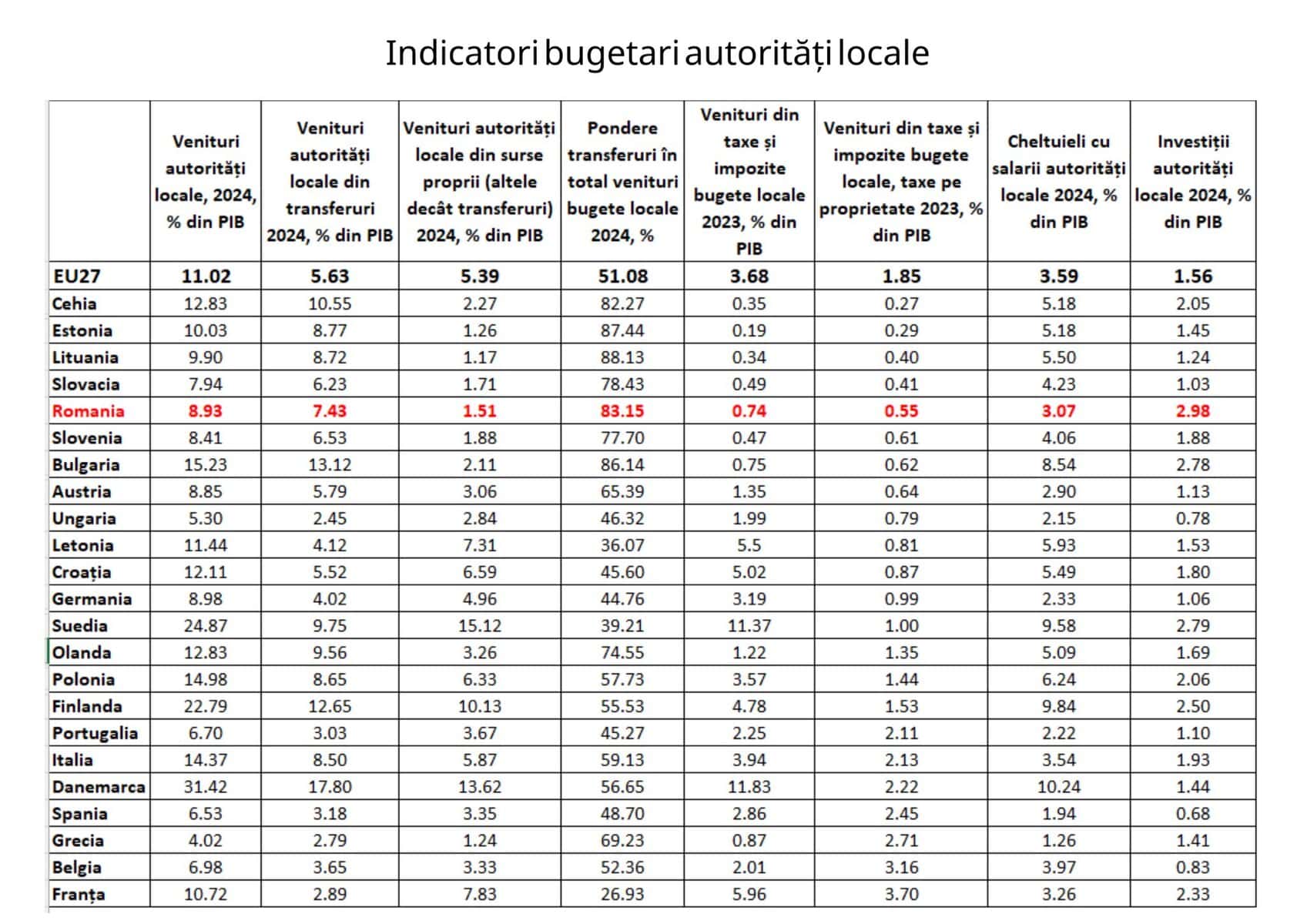 În România, cheltuielile cu salariile în administrațiile locale reprezintă 3,07% din PIB, față de 0,74% din PIB, venituri din taxe și impozite locale.