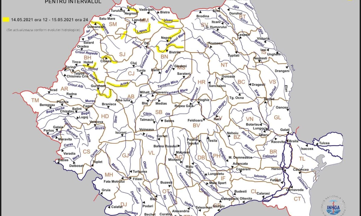 Autoritățile au emis o avertizare hidrologică legată de creșteri de debite pe râurile Arieș, Vişeu, Iza, Tur, Someş, Crasna, Crişul Repede, Crişul Negru, Crişul Alb.