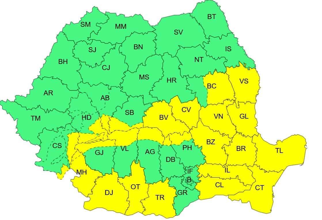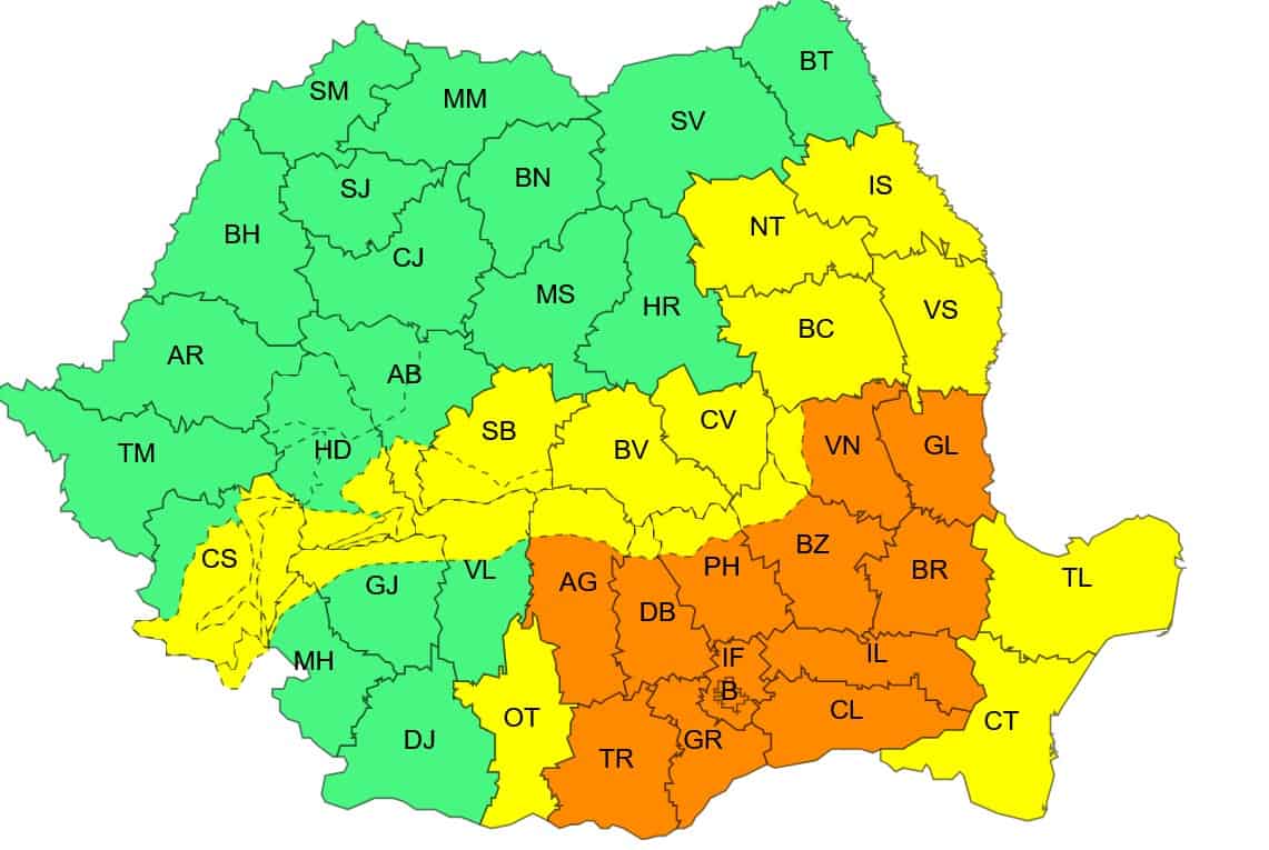 Au fost emise avertizări meteo Cod Galben și Cod Portocaliu. Local, se poate forma ghețuș sau polei.