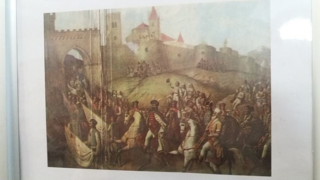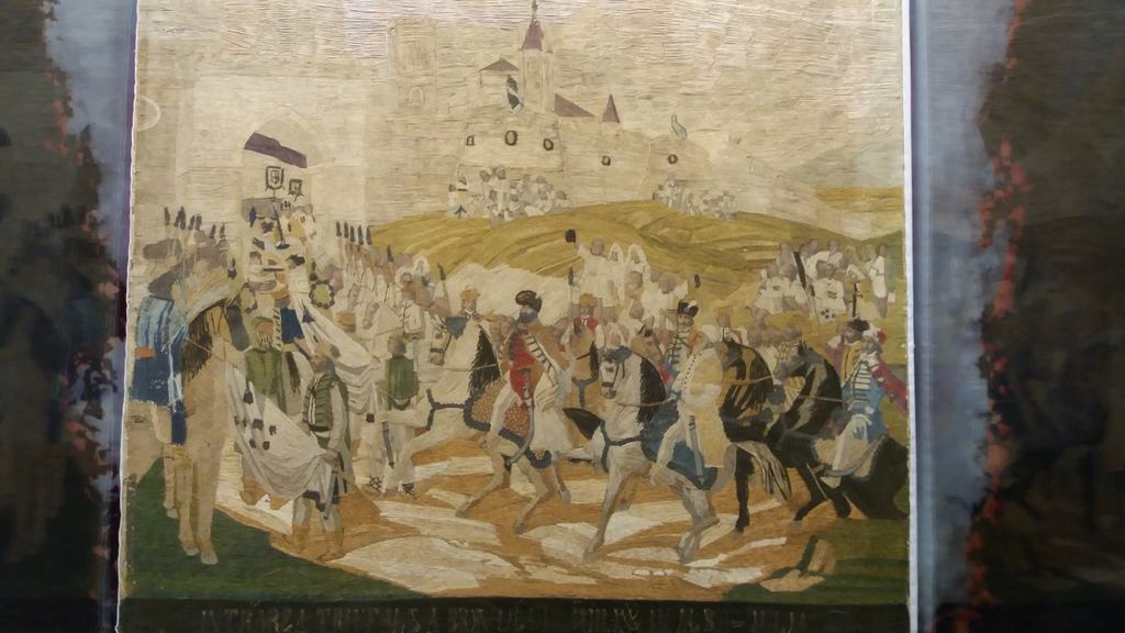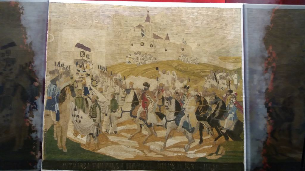 Broderie din sec XIX cu "Intrarea lui Mihai Viteazul în Alba Iulia" expusă la muzeul din Alba Iulia