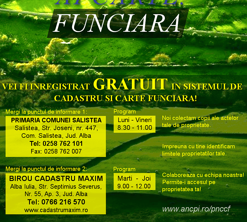 Cadastru Maxim SRL a semnat primul contract în judeţul Alba, de înregistrări sistematice GRATUITE în cartea funciară. Detalii pentru locuitorii din comuna Săliştea
