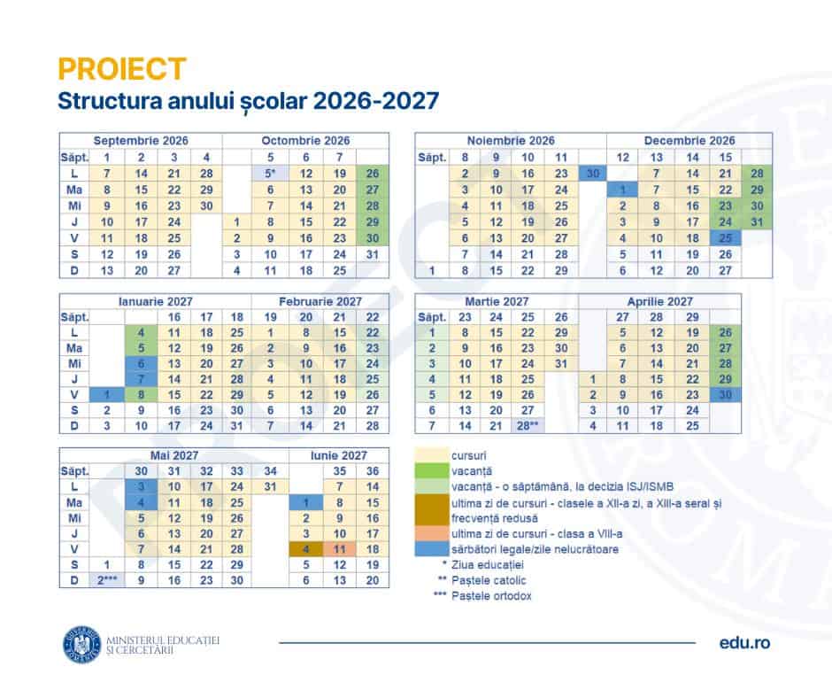 Anul şcolar 2026-2027 se structurează, pe intervale de cursuri și intervale de vacanță.