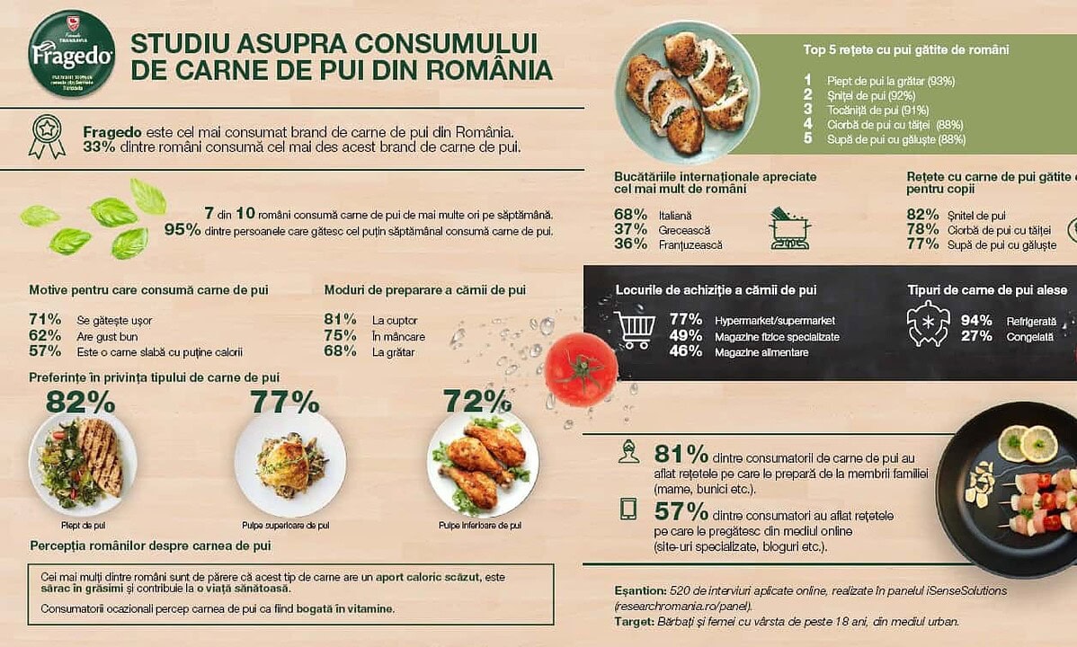 Datele studiului relevă tendințele actuale de consum pentru carnea de pasăre, o perspectivă a evoluției pieței, dar și topul celor mai populare rețete cu carne de pui gătite de români.