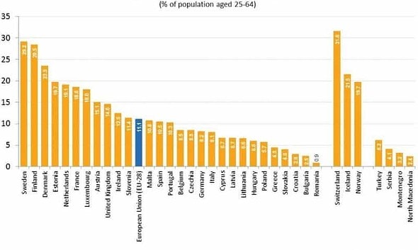 Valoarea cu care figurează România la Eurostat în materie de procentaj din populaţie cu vârsta cuprinsă între 25 şi 64 de ani care urmează o formă de învăţare în anul...