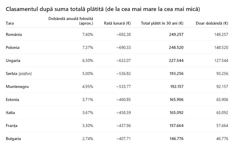 Pentru un împrumut de 100.000 de euro pe 30 de ani, suma totală plătită (principal + dobândă) variază masiv între țări: de la aprox. 146.776 de euro în Bulgaria la aprox. 249.257 de euro în România.