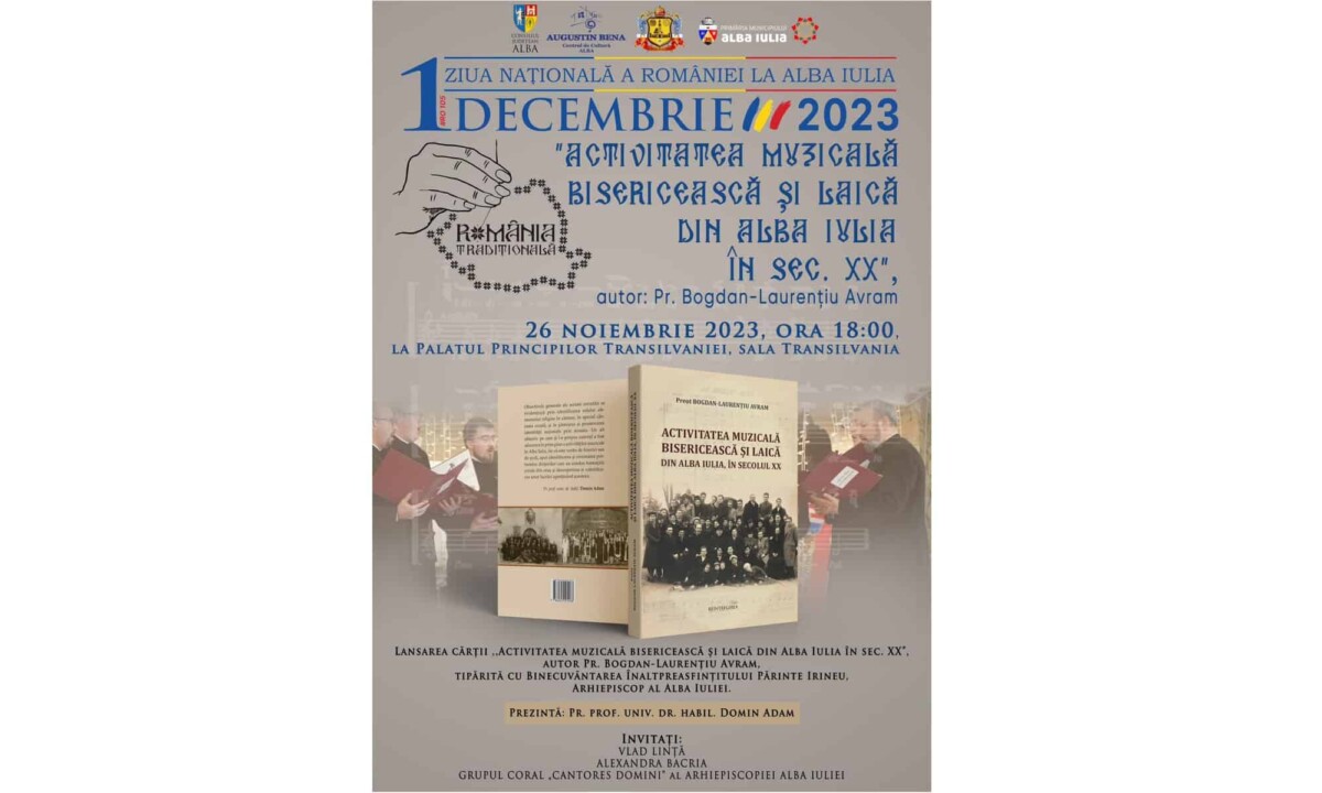 Manifestările cultural artistice, organizate de Consiliul Județean Alba și Centrul de Cultură „Augustin Bena” Alba pentru a marca Ziua Națională a României și împlinirea a 105 ani de la Marea Unire din 1918, vor debuta duminică, 26 noiembrie 2023, cu lansarea cărții „Activitatea muzicală bisericească și laică din Alba Iulia în sec. XX”, autor pr. Bogdan-Laurențiu Avram.