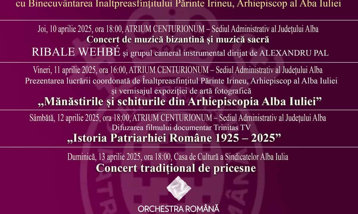 Duminică, 13 aprilie 2025, ora 18:00: CONCERTUL DE PRICESNE „CREDINȚĂ ŞI UNIRE” la Casa de Cultură a Sindicatelor din Alba Iulia. Acesta va aduce pe aceeași scenă o serie de invitați deosebiți, printre care Corul de copii THEOTOKOS, Pr. Călin Bulac, Pr. Doru Gheaja, Grupul coral CANTORES DOMINI al Arhiepiscopiei Alba Iuliei, Anamaria Marti, Roxana Reche, Ioana Breda Morar, Nicolae Plută, Dorina Narița, Floricica Moga, Grupul vocal tradițional MUGURI DE TEZAUR și Leontina Fărcaș, acompaniați de Orchestra Română de Folclor dirijată de Alexandru Pal.