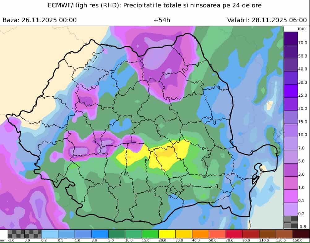 Vineri (28 noiembrie) aria ciclonică în analiză (ciclonul ADEL) rămâne deasupra Greciei, iar frontul cald (ce produce ascendența aerului cald și umed) va influența și partea de sud a României, unde va continua să plouă moderat cantitativ (în general 10…30 l/mp).