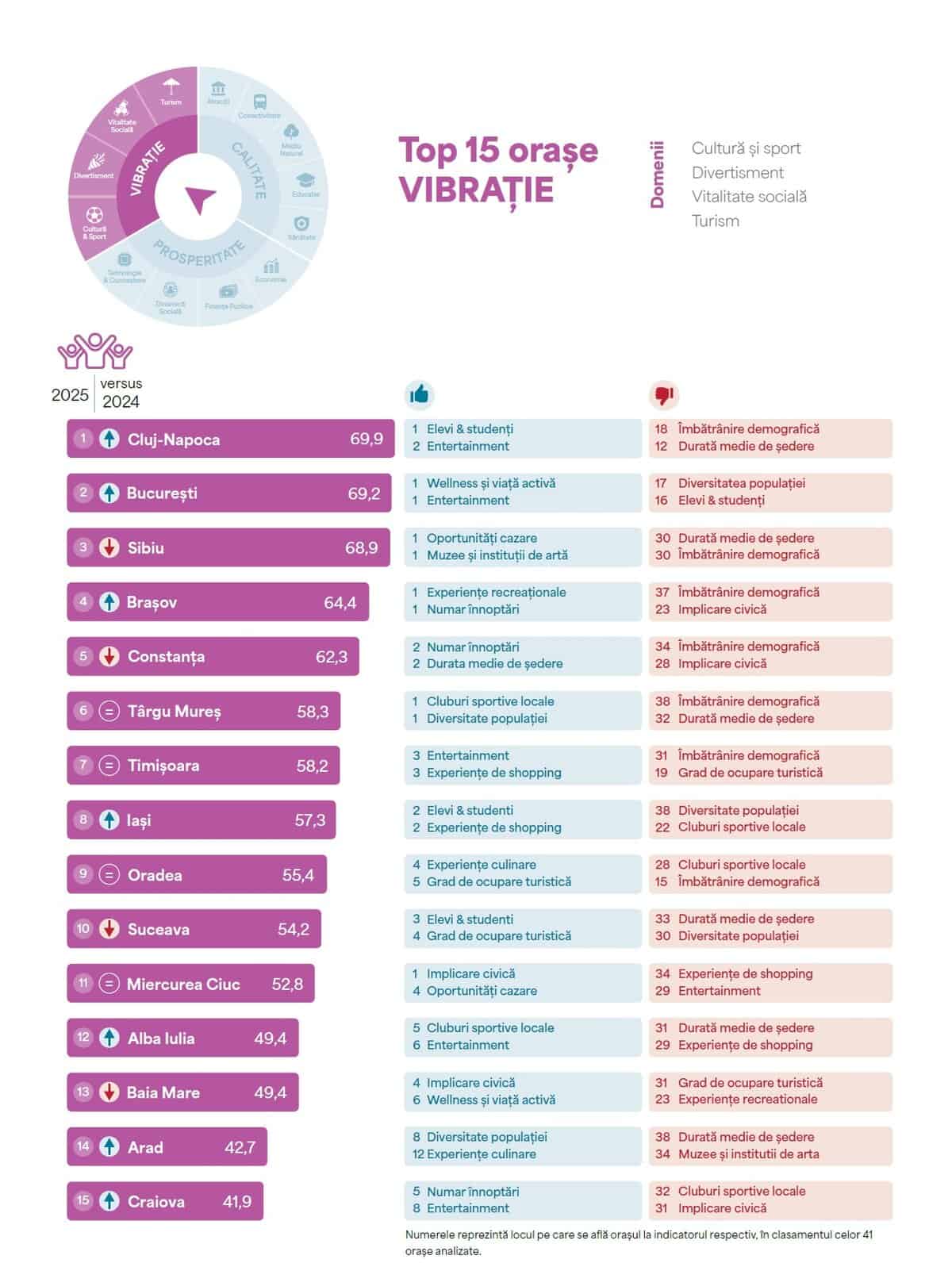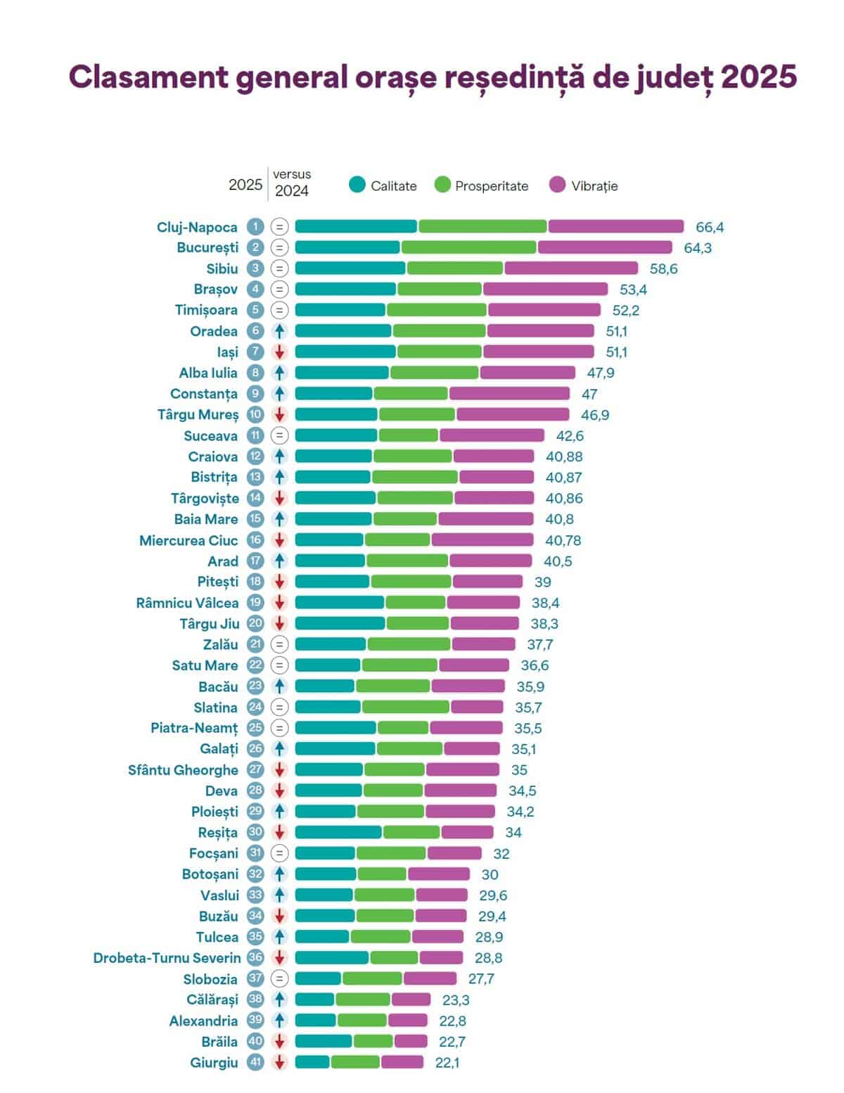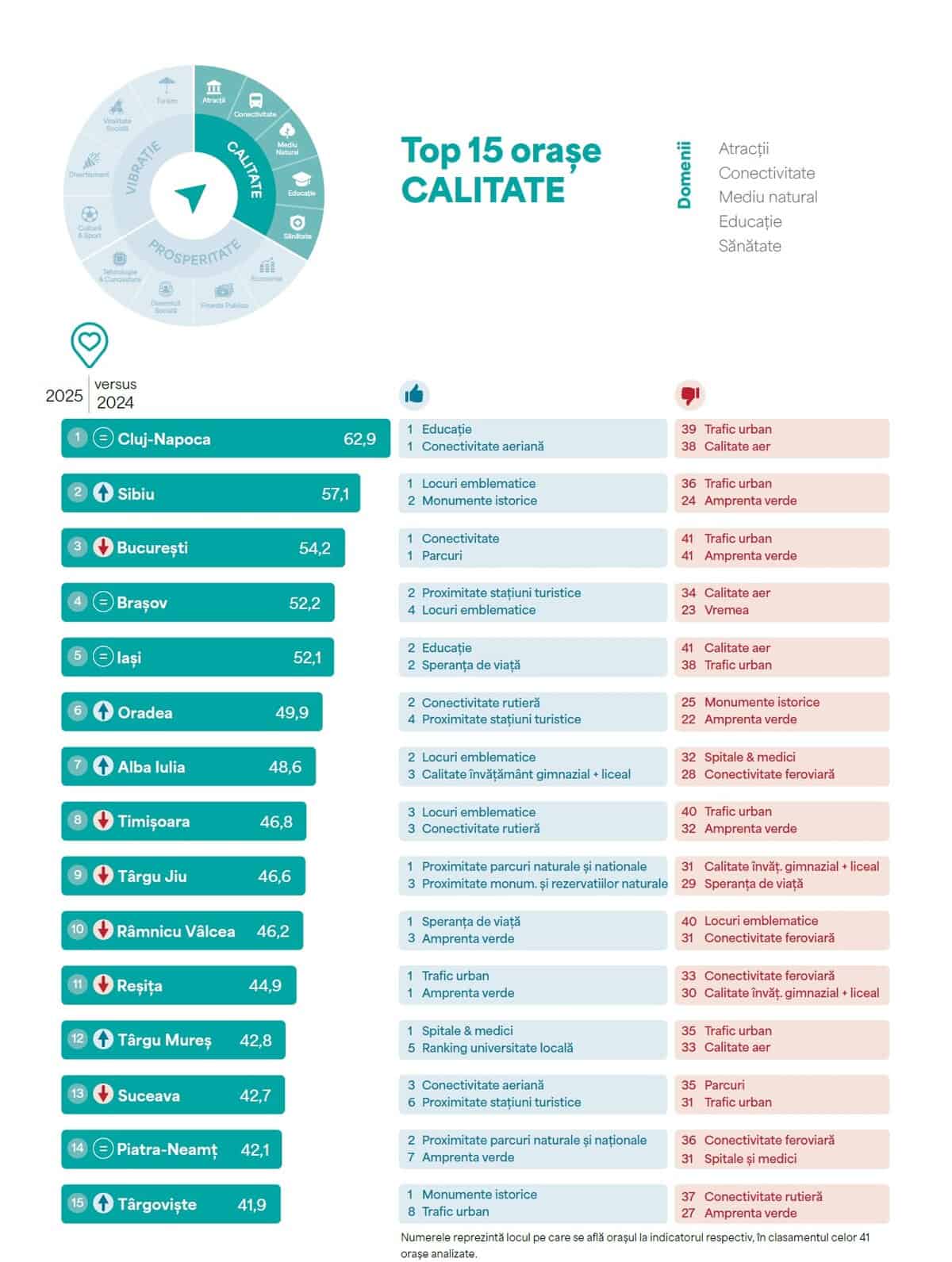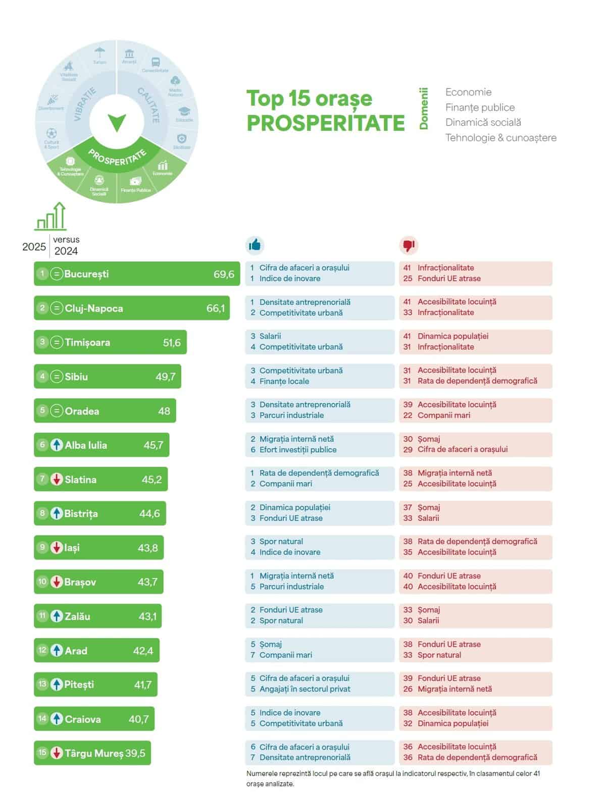 Potrivit raportului, cel mai performant oraș din România rămâne și în acest an municipiul Cluj-Napoca. Acesta este urmat de București, Sibiu, Brașov, Timișoara, Oradea, Iași, Alba Iulia, Constanța și Târgu Mureș. Pe ultimele locuri se află Giurgiu, Brăila, Alexandria, Călărași și Slobozia.