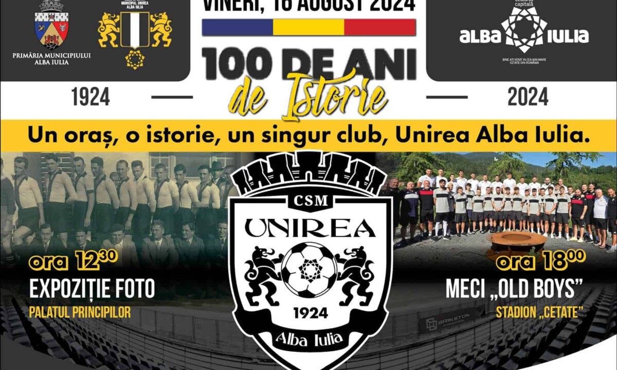 Clubul de fotbal Unirea Alba Iulia împlinește în această săptămână 100 de ani de existență. Pentru a marca evenimentul, vineri, 16 august, la Palatul Principilor va fi deschisă o expoziție foto dedicată celor 100 de ani în alb-negru.