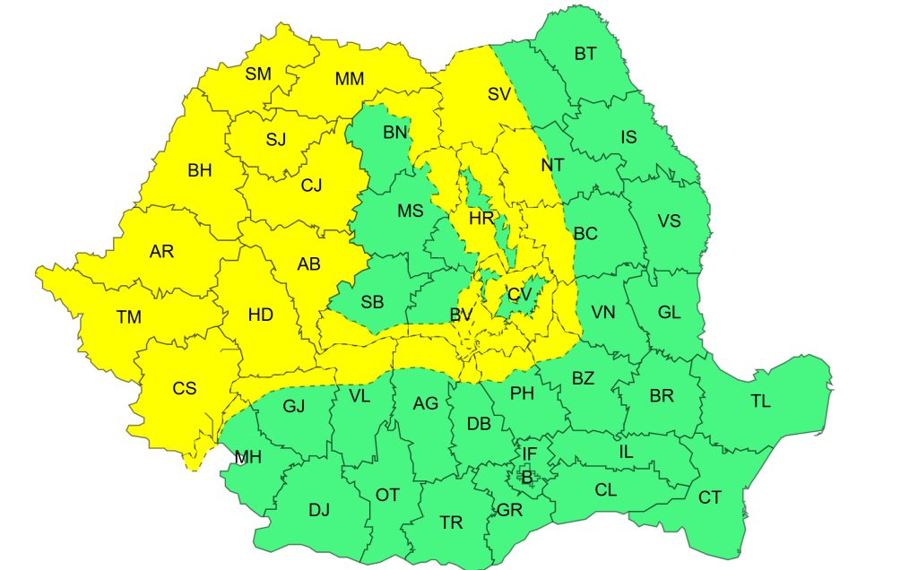 Potrivit meteorologilor, vântul va avea temporar intensificări, la început în Banat și Crișana, iar spre seară și noaptea și în vestul Transilvaniei și Maramureș, cu viteze de 50-60 de kilometri la oră și izolat de 70 kilometri la oră.